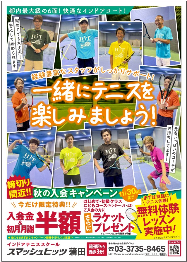 TOP おとなコース こどもコース 施設紹介 スクール紹介 スタッフ紹介 体験レッスン スケジュール 初めての方はコチラ 閉じる※再表示は更新ボタン キャンペーン 施設の様子 2024/11/28 【2025年 年間スケジュール】 メニュー Instagram smash_hits_kamata ★蒲田駅から徒歩5分 ★冷暖房完備 ★コート面数6面 ★インドアテニススクール 【コーチ募集中】 【レッスン体験受付中】 【新作】 ダンロップFX500 まだ未発売 #スマッシュヒッツ蒲田 #テニス #テニ さらに読み込む Instagram でフォロー アクセス お問合せ 体験レッスンはコチラ 会員ログイン 〒136-0076 東京都江東区南砂6-7-15 トピレックプラザ イオン館屋上 〒144-0051 東京都大田区西蒲田8-24-12イモンボウル2F・3F・6F 受付時間 月〜金:9:00〜21:30 土:7:30~20:00 日:7:30~18:00 TOP おとなコース こどもコース 施設紹介 スクール紹介 スタッフ紹介 体験レッスン スケジュール プライバシーポリシー