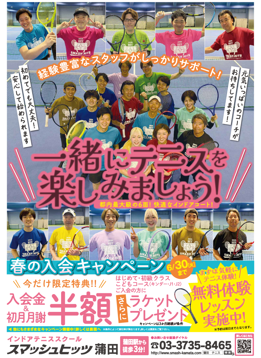 TOP おとなコース こどもコース 施設紹介 スクール紹介 スタッフ紹介 体験レッスン スケジュール 初めての方はコチラ 閉じる※再表示は更新ボタン キャンペーン イベント 施設の様子 2026/02/25 【2026年 年間スケジュール】 2025/12/23 【月会費改定のお知らせ】 2024/11/28 【2025年 年間スケジュール】 メニュー Instagram smash_hits_kamata ★蒲田駅から徒歩5分 ★冷暖房完備 ★コート面数6面 ★インドアテニススクール 【コーチ募集中】 【レッスン体験受付中】 【スマッシュヒッツ蒲田 学生アルバイトコーチ】 当スクールでは,学生アルバイトコーチ募集中! ぜひ 【テニス好きにおすすめしたいプレゼント🎁】 〜happy socks〜 #スマッシュヒッツ蒲田 【正しいテニスシューズの履き方3選】 ぜひ参考にしてください😊 #スマッシュヒッツ蒲田 #テニス スマッシュヒッツ蒲田 〜HIT TENNIS TEAM〜 実績のある優秀なコーチ陣が蒲田駅 徒歩5分 【遠いボールのおすすめフットワーク】 今回はストロークの、フットワークについてです😊 #スマッシ 【グリップテープ綺麗な巻き方】 グリップテープが綺麗に巻かれている方が落ち着きますよね😊 #スマッ 【ワンポイントレッスン動画】 遊佐から皆様に、速いサーブを打つ時に意識してるちょっとした良いことをお スマッシュヒッツ蒲田! 今年も恒例の豆まき大会やりました。 コーチが鬼になり、みんなは豆の代わり さらに読み込む Instagram でフォロー アクセス お問合せ 体験レッスンはコチラ 会員ログイン 〒136-0076 東京都江東区南砂6-7-15 トピレックプラザ イオン館屋上 〒144-0051 東京都大田区西蒲田8-24-12イモンボウル2F・3F・6F 受付時間 月〜金:9:00〜21:30 土:7:30~20:00 日:7:30~18:00 TOP おとなコース こどもコース 施設紹介 スクール紹介 スタッフ紹介 体験レッスン スケジュール プライバシーポリシー